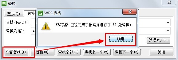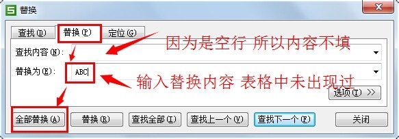 6、在替换对话框中,因为定位的是空白行,所以 查找内容不需要填写,替换为我们填写的内容需要原来表格中没有的内容以---ABC为例。填写完成后,我们根据提示退出。