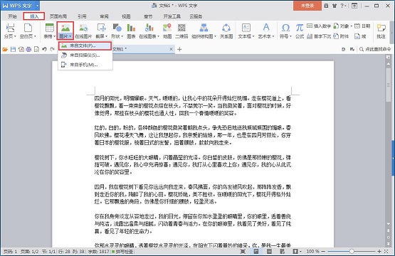 2、把光标放在文字中间,点击“插入”菜单下的“图片==来自文件”,将图片插入文字当中;