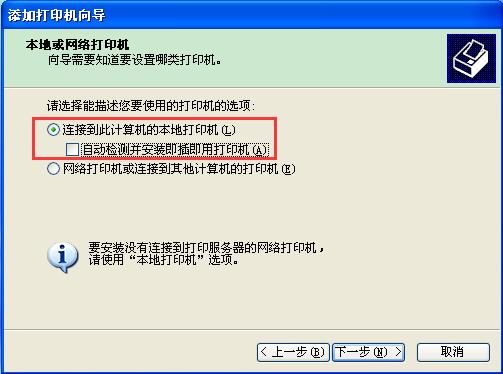 3、在“要使用的打印机的选项:”中选择“连接到此计算机的本地打印机”,去掉“自动检测并安装即插即用打印机”前面的复选框,然后点击“下一步”。