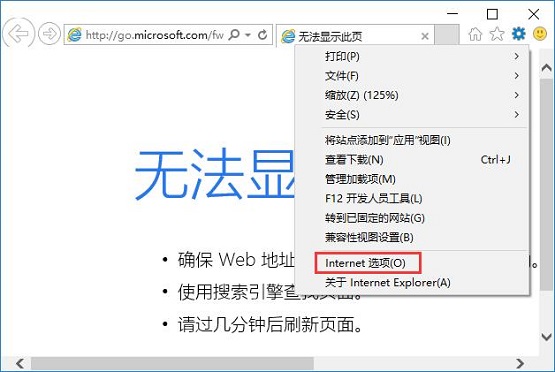 2、点击浏览器右上角的菜单按钮,在选项中点击“Internet选项”;