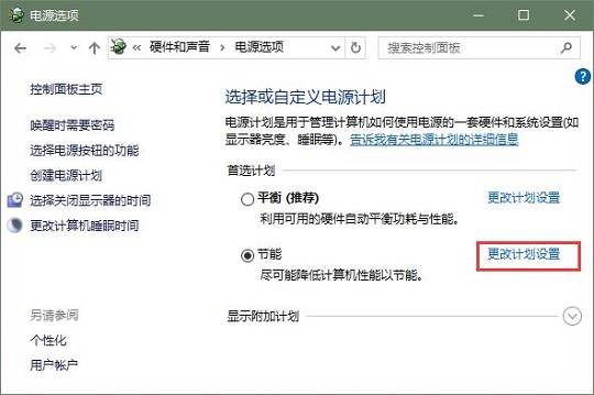 1、依次进入:控制面板——硬件和声音——电源选项,然后找到正在使用的电源计划,选择其右边的“更该计划设置”;