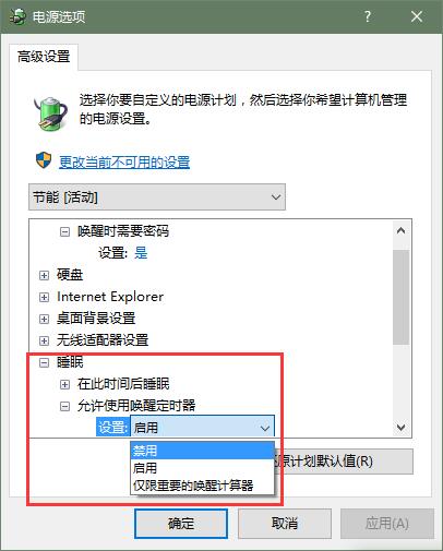 3、你还可以点击上面的选单,切换不同的电源计划,为其禁用掉睡眠中的“使用唤醒定时器”功能。