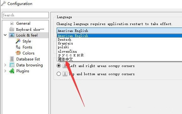 3、选择“look&feel”选项,可以看到语言选项为“American English”,点击并在下拉界面选择简体中文就可以了。