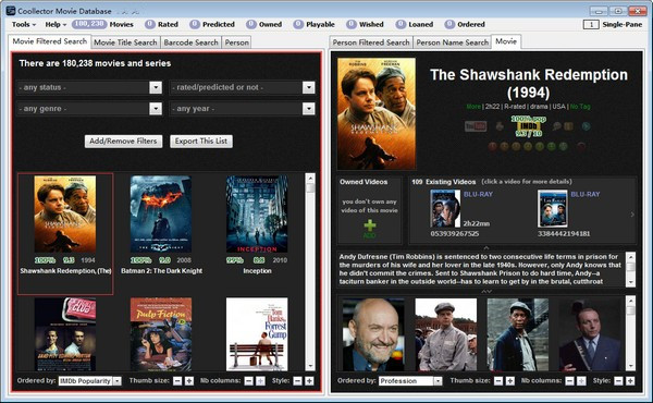 2、个性化所有数据。你可以改变所有你所了解(从‘卓越的’到‘糟糕的’)的电影和人物。你可以谈论在你所拥有的收藏当中包含电影的技术细节。你可以保持对借出电影的跟踪。你可以管理你的希望列表。