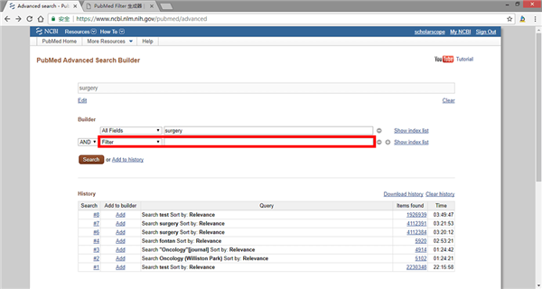 然后打开 PubMed 页面,点击“Advance”进入高级模式,下拉菜单选择“Filter”,粘贴刚才复制的代码,就ok了;