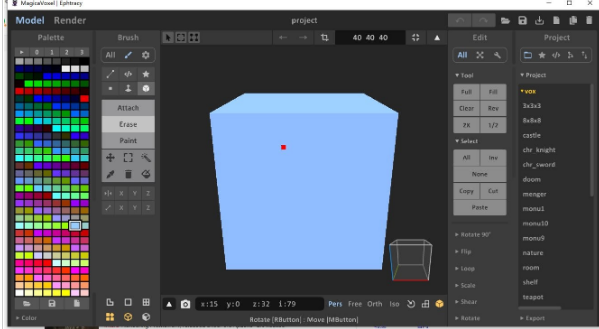 尽管MagicaVoxel没有那么令人印象深刻的时候,它的功能,它通过其显着的直观性;任何用户,甚至那些有素的编辑或其他3D建模应用程序之前没有任何经验,可以开始创建的对象吧,无需经过冗长的教程。你习惯于应用程序的基本功能后,你可以利用配置的键盘快捷键来加快创造过程和更高效地工作。