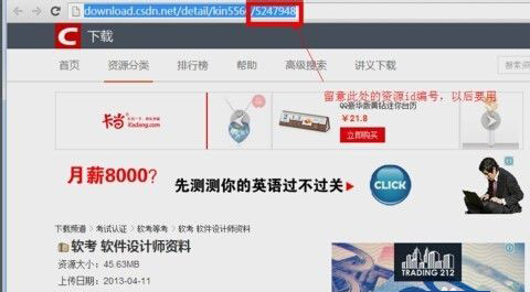 首先在csdn下载中找到你搜索想要的资源,例如此处我找到了我想要的软件设计师考试资料。打开网页,在网址栏留意最后的资源id编号,可以拷贝下来。