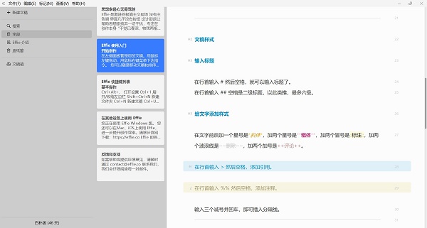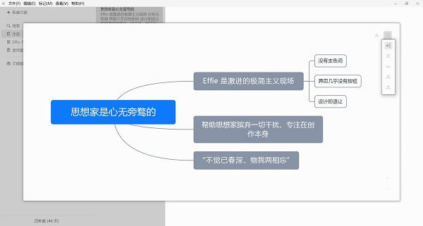 Effie写作软件是一款看起来很有格调的工具,无论是严肃写作、随手记录,还可以把思路整理成大纲或者是思维导图,软件都能帮你实现。以最简洁的方式提高了整体的工作效率,小说故事大纲罗列出来以后就不会瞎写导致前后矛盾,很多喜欢思考的朋友也都会使用这款软件,记录一些自己的心得。