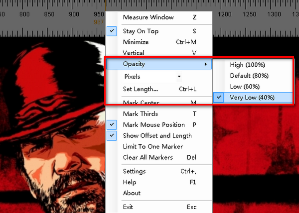 Screen Ruler官方版可以随时浮在最上层,可以任意调节透明度。