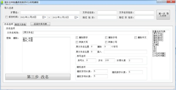 二、规则改名 1.原文件名删除数字2.原文件名删除字母3.原文件名删除中文 4.原文件名转换大小写5.原文件名自定义多组替换删除 6.原文件名指定位置删除7.原文件名指定位置插入字符 8.添加序号 9.添加日期 等等。