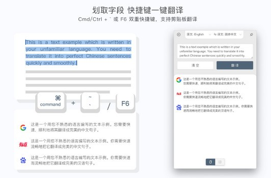 1、快捷翻译:选中待翻译文本,只需按下快捷键,多译帮您快捷翻译,无论您正在使用浏览器 Word 还是Pages,均可一键翻译需要的文字。