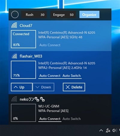 Engage - 根据信号强度、顺序和无线配置文件的自动切换设置执行自动连接(数字表示信号强度的阈值(%))。