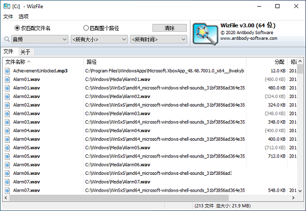 输入时将显示结果-您应该注意到列表是实时更新的,关键字在文件名和路径中都突出显示。除了文件名及其位置,WizFile 还显示文件大小,其时间戳和特殊属性。