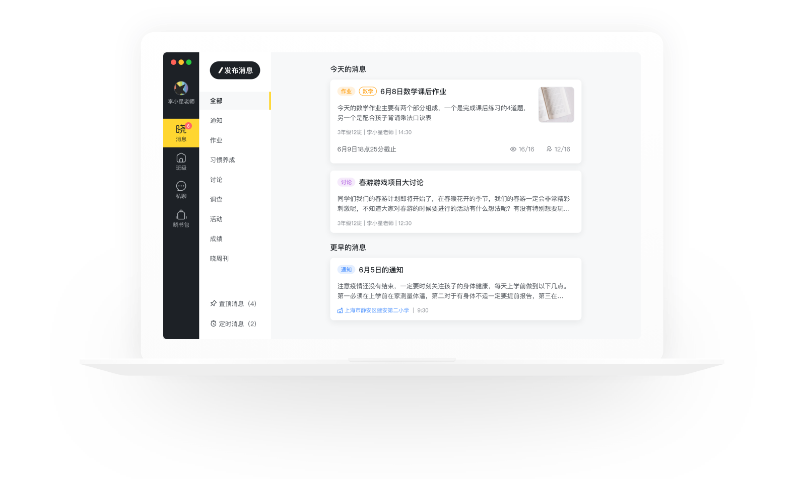 晓黑板支持发送图片、语音、文字、表情、晓调查等内容。您可以把黑板作业拍摄下来发送给家长,使家长们知晓。