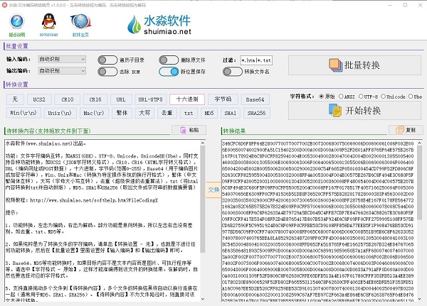 水淼文件编码转换精灵是水淼软件出品的一款文件编码转换工具,可以转换ANSI(GBK)、UTF-8、Unicode等编码,也有一些常用的转换功能,比如繁体简体的转换、大小写的转换等,支持全球语言,支持大文件。软件非常实用,可以直接拖动文件到软件界面里,左右键点击转换按钮分别是编码和解码。