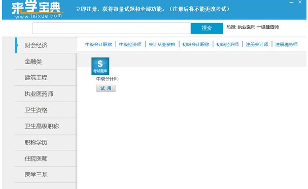 答:来学宝典所有科目均可试用,您可以在我们官网下载试用我们的软件,可以显示5%的试题数量,可以供您试用,同时在界面的最下方显示试题的数量。
