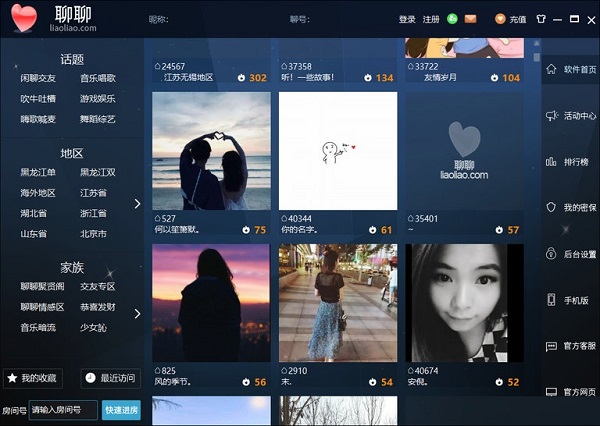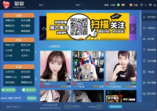 聊聊电脑客户端给大家提供一个可以聊天交友的地方,里面有很多有意思的视频聊天室,大家可以寻找自己喜欢的人去搭讪聊天,采用mp3级高清语音,语音通话的效果很好,聊聊视频语音聊天室软件界面美观,操作简便,各种兴趣爱好的人聚在一起,你总能找到跟自己志同道合的人,通过这款软件脱单的人非常多,不过这也是需要一些运气的。欢迎大家来这个平台多聊聊天,增加一点机会。