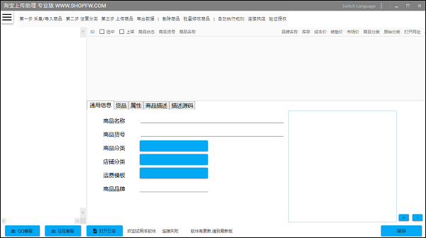 把数据快速上传到自己商城。上传时自动添加商品名称、属性、价格、图片、描述等信息。