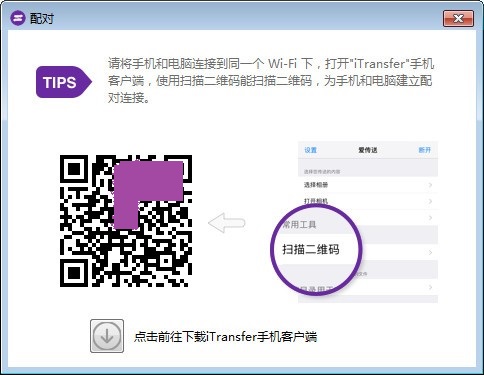 请将手机和电脑连接到同一个Wi-Fi下,打开 “iTransfer”手机客户端,使用扫描二维码能扫描二维码,为手机和电脑建立配对连接。