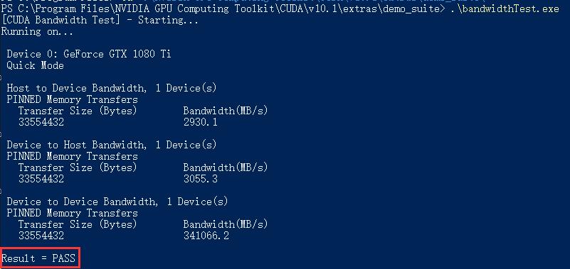 3、验证是否配置成功,分别运行这两个程序deviceQuery.exe、bandwidthTest.exe ,cd到安装目录下的 。。.\extras\demo_suite,result=pass则安装成功